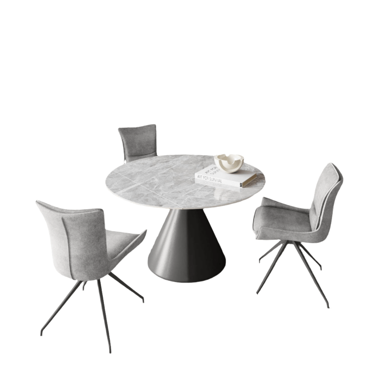 This grey round ceramic extending dining table with swivel chairs is ideal for homeowners seeking space-saving dining furniture with premium materials and innovative functionality. Its neutral grey tones and architectural steel detailing make it a versatile choice for modern, minimalist, and contemporary UK interiors.