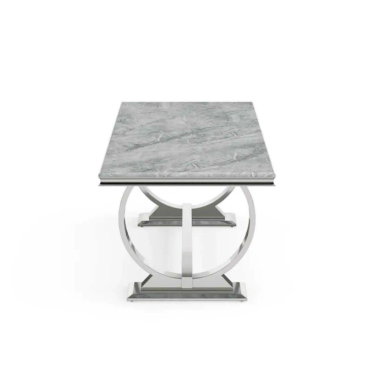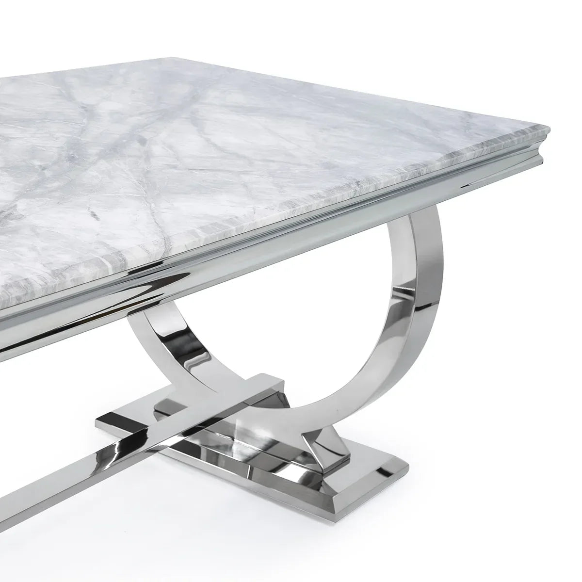 At the heart of the set is the stunning Arianna dining table, finished with a sleek grey marble-effect top.