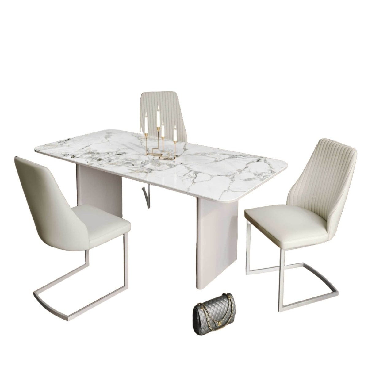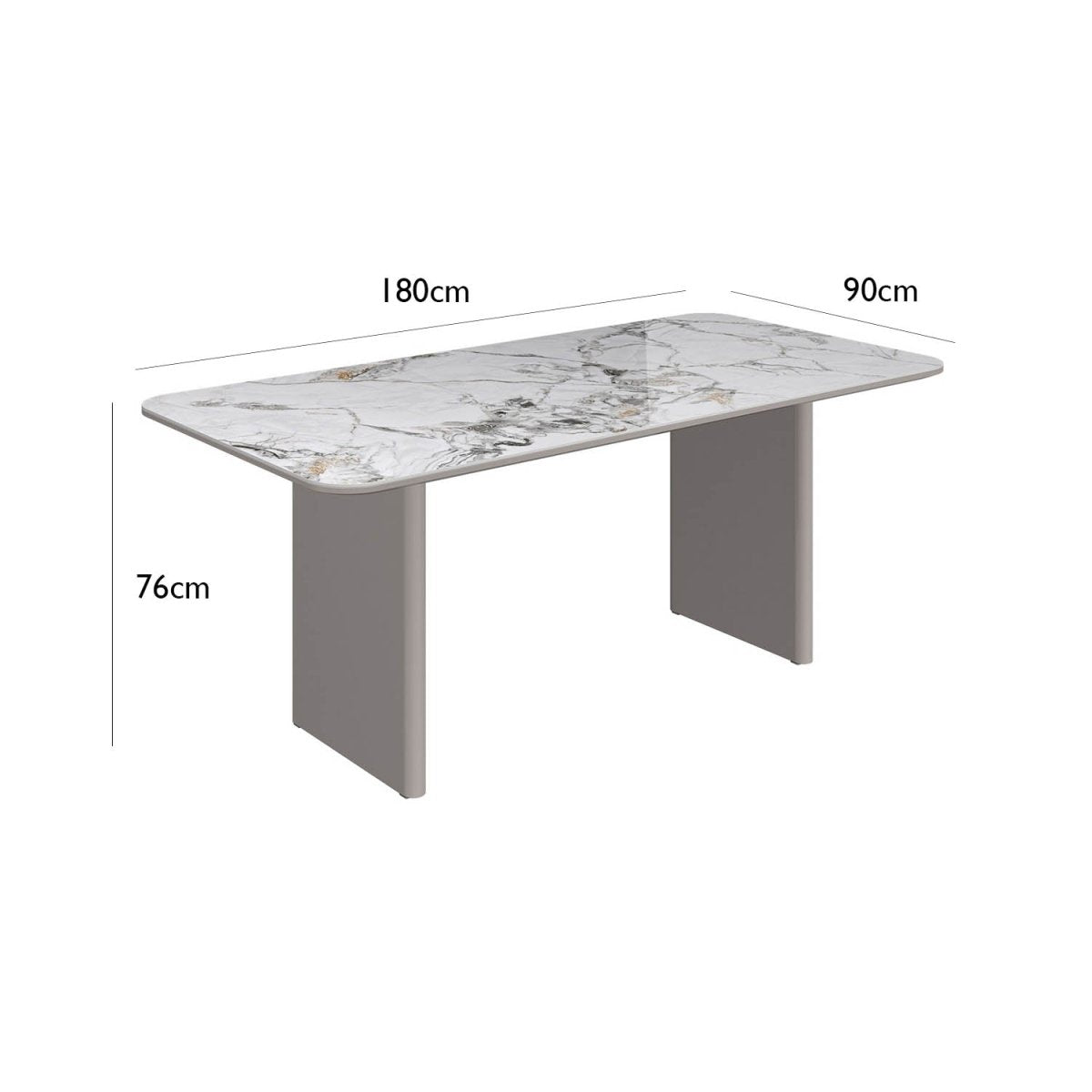 The 180cm tabletop is crafted from 6mm premium sintered stone with a luminous white marble-effect finish. This ultra-durable ceramic surface is heat-resistant, scratch-resistant, and stain-resistant, ensuring long-lasting beauty and performance.