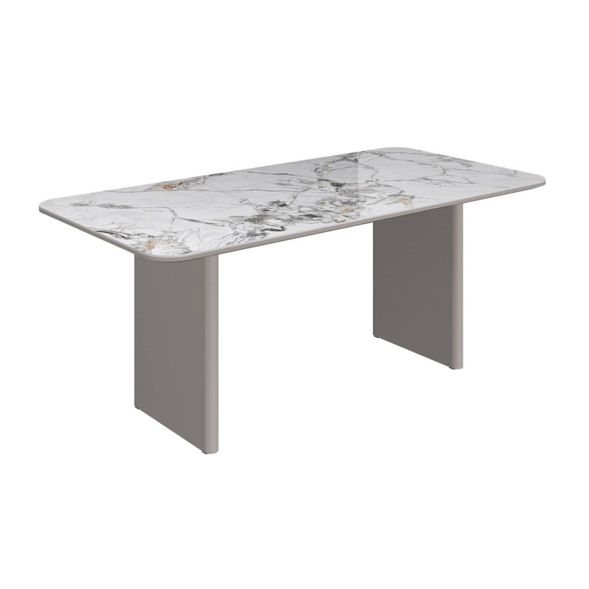 At the heart of the ensemble is the Monument Ceramic Dining Table, featuring an expansive 180cm high-gloss white marble-effect tabletop. Crafted from 6mm premium sintered stone ceramic, the surface delivers exceptional visual depth while remaining fully non-porous, heat-resistant, stain-resistant, and scratch-resistant. Designed for real-world performance, this table is ideal for frequent entertaining and long-term use. The tabletop is framed by a light-grey architectural base, engineered for maximum strength and stability. Rounded and beveled safety edges enhance both durability and refinement, reinforcing the table’s sculptural, high-end appeal.