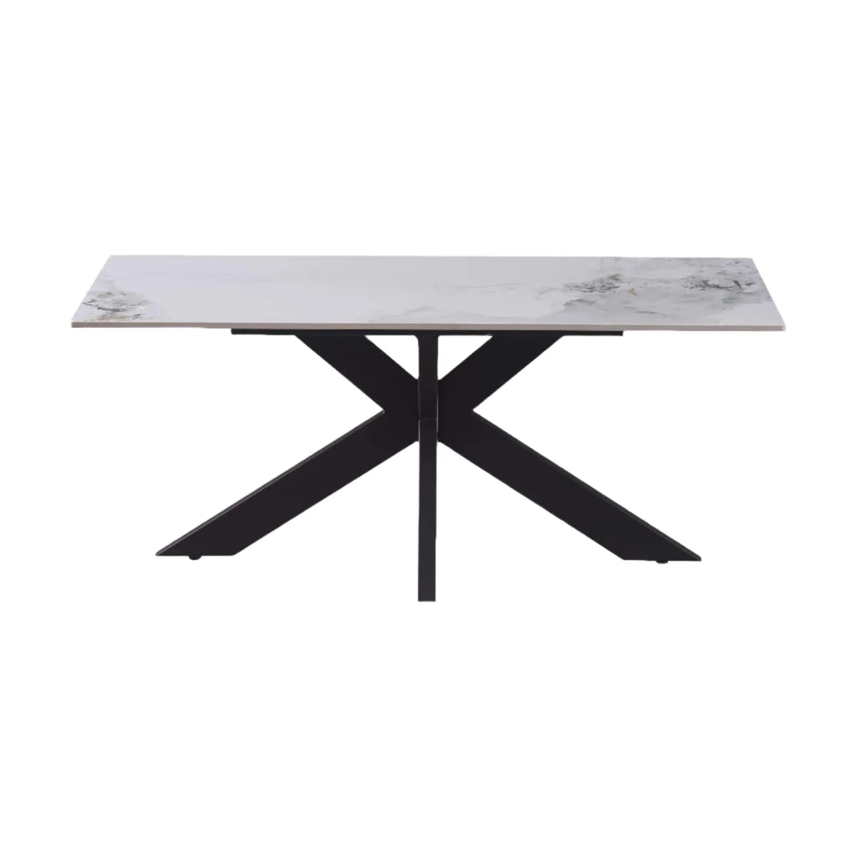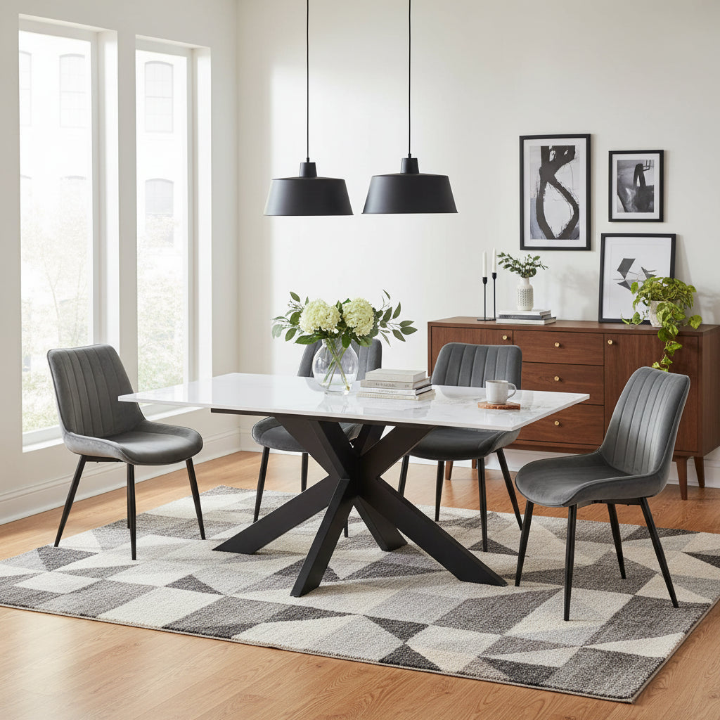 At the centre of the collection is the 1.5m Nordic Dining Table, crafted with a premium sintered stone ceramic tabletop. Inspired by natural stone, the white surface features a soft marble-effect grain with subtle grey, charcoal, and earthy undertones, creating a calm and contemporary aesthetic. Designed for real-world use, this scratch-resistant, heat-resistant dining table is built to withstand daily dining and entertaining. The compact 1.5m frame is supported by a bold black metal X-frame pedestal, offering a striking architectural focal point while maximising legroom—ideal for space-efficient dining layouts.
