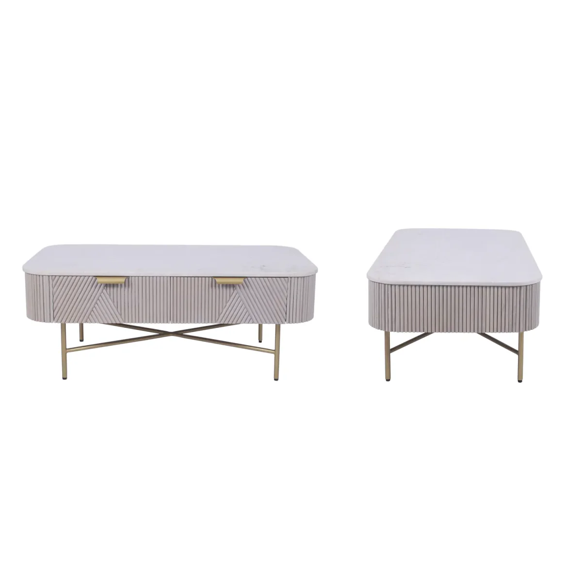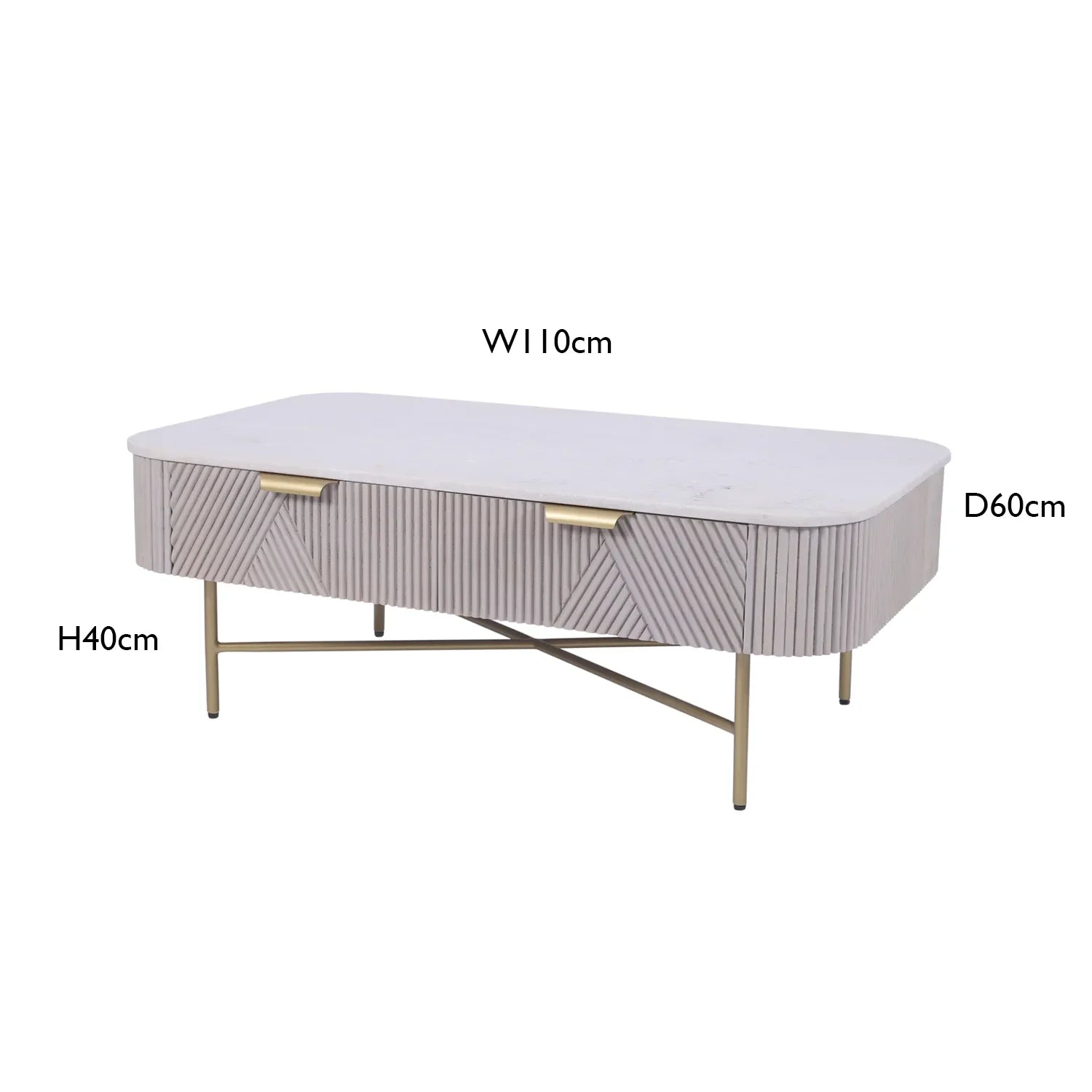 Marble Top Coffee Table with Fluted Mango Wood Drawers