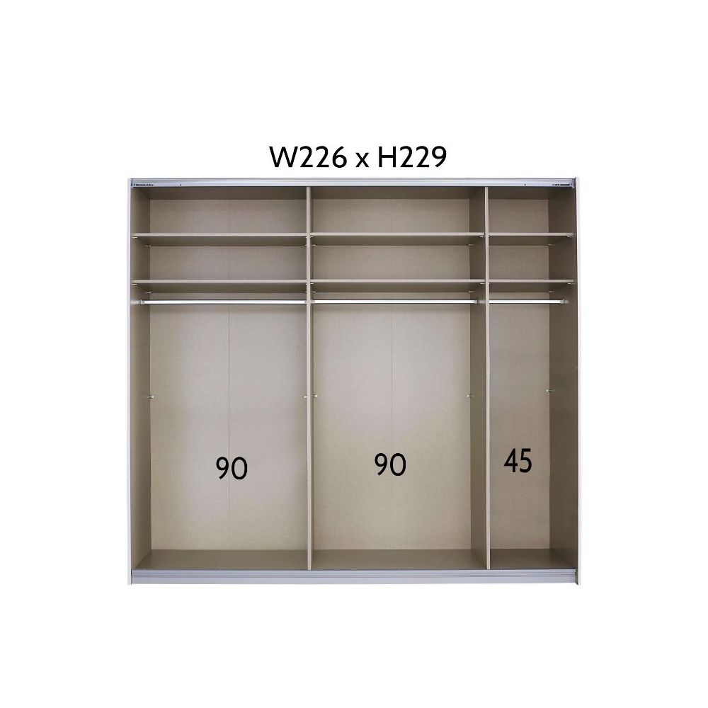 Designed with two smooth-gliding sliding doors, featuring one high-gloss glass panel and one full-length mirrored door, the wardrobe enhances light reflection and adds a sense of spaciousness to your interior. The mirror door creates depth and brightness, while the glass finish brings a polished, luxury aesthetic to your room. Coordinated metal handle strips ensure effortless operation and a refined modern finish.